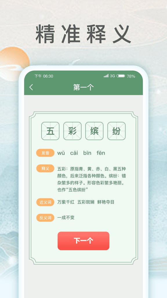 【海量词库】软件拥有庞大的成语数据库,每个成语都配有详尽的释义解析、近反义词对照、标准发音示范以及成语典故讲解。用户既可以在精选成语专栏系统学习,也能通过智能搜索功能快速查找目标成语,满足不同层次的学习需求。
