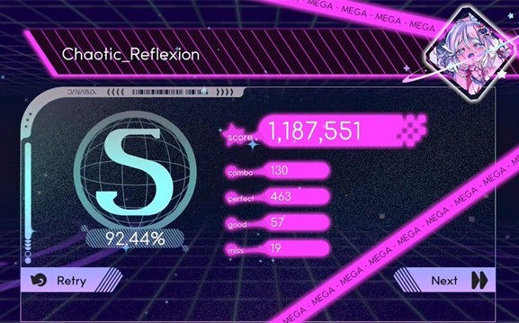 游戏延续系列标志性的三轨下落玩法,屏幕左、中、右三个轨道分别对应不同乐器的音轨,玩家需同步处理三类轨道中下落的点击、滑动、长按等音符,模拟指挥乐队的沉浸体验。同时游戏设置了从入门 Basic 到高难 Giga 的多档难度,还支持镜向、扣血等特殊模式叠加,既能让新手轻松上手,也能满足硬核玩家对极限操作的追求。而且精准击打音符时会触发粒子爆炸等炫光特效,强化操作的打击反馈,让每一次演奏都有强烈的爽感。