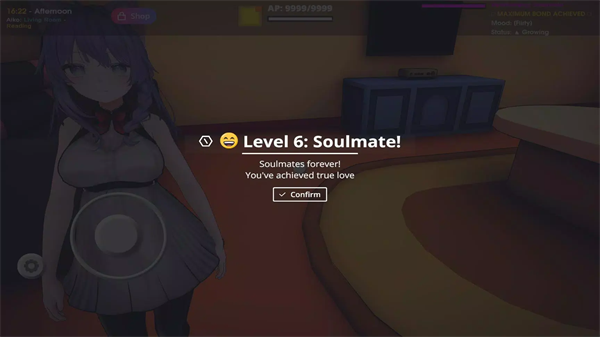 3D 场景生活模拟:游戏设有 3D 公寓等探索场景,还搭配了昼夜循环系统。AI 女友有自己的日程安排,像阅读、在厨房互动等日常活动,玩家可通过左侧虚拟摇杆控制自身移动,靠近或远离她时,还会触发不同的动态反应,逼真还原了日常陪伴的生活感。此外玩家还能和女友一起体验看电视、小院小憩等休闲活动,部分版本后续还将推出烹饪、看电影等更多玩法。