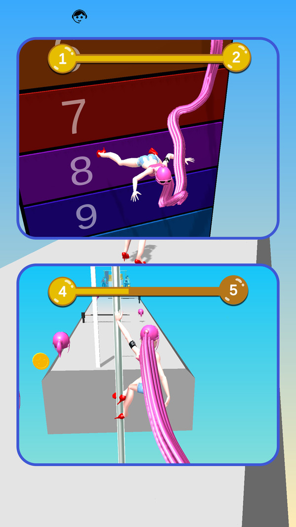 玩家主要通过触摸屏幕进行操作,操控屏幕中的美女角色左右移动,穿梭于充满奇幻色彩的美妆世界。在前行过程中,美女需要收集散落在道路上的各色头发,一旦成功收集,她自身的头发便会依据所获头发的特质变长、变颜色,解锁更多绚丽造型。但需注意,道路上并非一帆风顺,还会随机出现如圆锯、剪刀这类危险物品,倘若美女不小心碰到,她精心收集、变长变色的头发将会被无情剪断,功亏一篑,所以玩家需要时刻保持警惕,精准操控角色躲避危险。成功登上舞台 展示漂亮的长发。