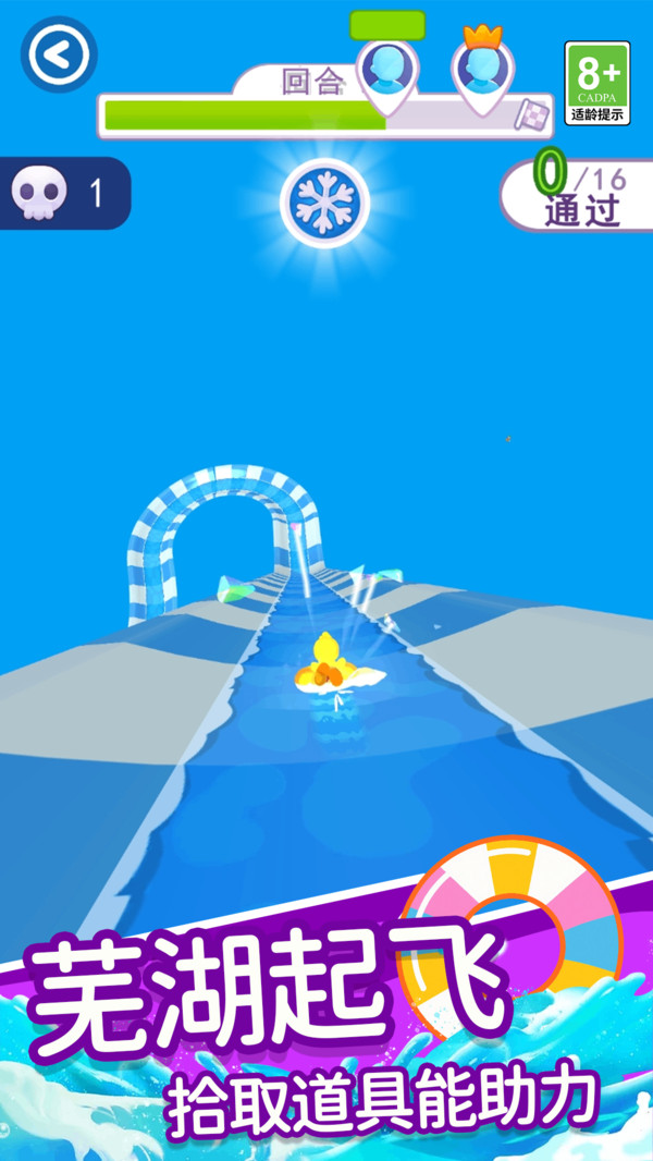 1、滑动屏幕控制角色在水道中穿梭,躲避障碍,冲击终点。