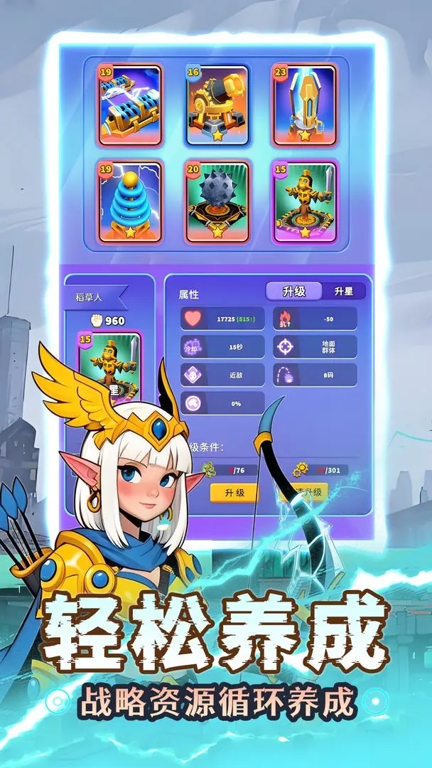 游戏中,玩家可以利用战斗中获得的资源,对英雄、塔防建筑以及家园进行局外养成。通过不断的提升,你不仅能解锁更多的道具与金币奖励,还能攻克更高难度的关卡。丰富的养成系统为玩家提供了多样的选择,使每位玩家都能根据自身兴趣,追求不同的成长目标和玩法体验。