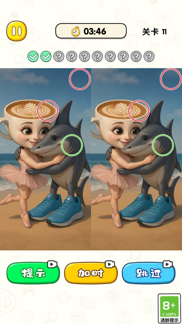 3、画面对比聚焦性强,左右图呈现让差异点易察觉,同时保留一定寻找难度,平衡趣味与挑战。