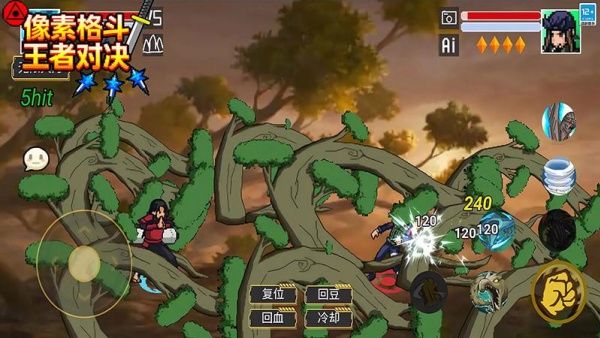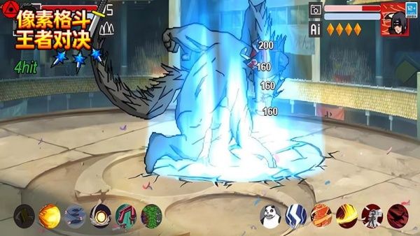 2、高度还原原始技能,像螺旋丸、千鸟等技能在像素画风中呈现,搭配连招与必杀技,打造爽快战斗体验。
