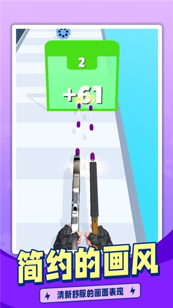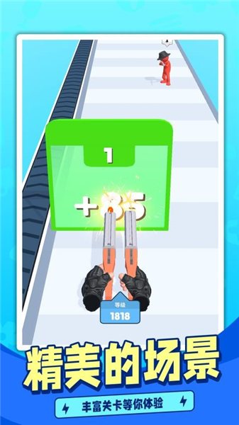 枪手跑酷是一款热门的跑酷闯关手游,简约的游戏画风和轻松的操作快速上手,融合了射击和跑酷的玩法,在跑道之中跑酷冲刺,可以射击跑道内的选择门,解锁获取全新武器或是道具,前进过程中还会遇到难题和陷阱,要想办法顺利的通过哦!