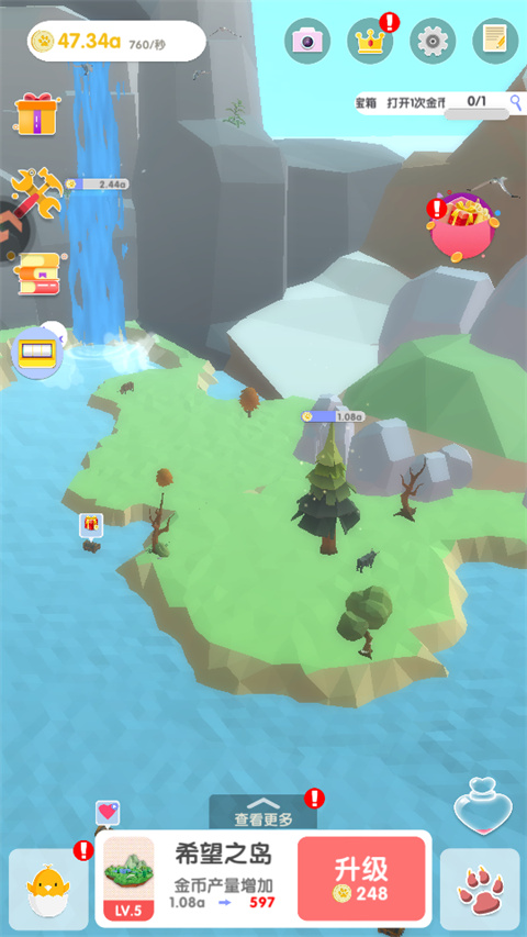 陆地建设:玩家初始拥有一片空荡海域,需跟随教程为动物建立栖息地。栖息地产出金币,可用于升级陆地,增加金币产出。积累足够金币后,可购买动物,动物开心时会生产爱心,收集爱心能进一步升级陆地,扩大规模。
