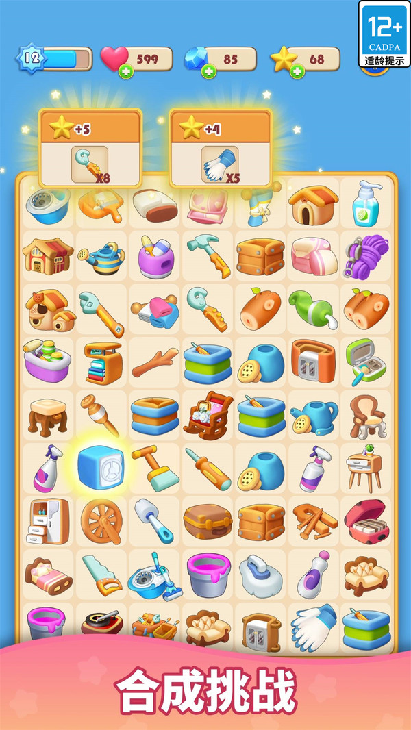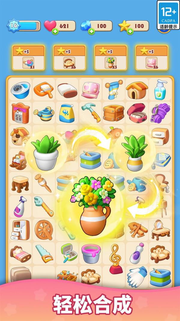 将拼图游戏板上的两个相同元素合并,创造新的物品和工具,以翻新客厅、卧室、厨房、花园和温室等各种房间;