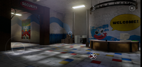 场景探索收集:玩家通过左侧摇杆控制角色在废弃玩具工厂里移动,右下角设有跳跃按键,还能完成下蹲等操作。场景中高亮的道具会被自动收取,点击右上角暂停按钮并选择 ITEM,就能查看已获取的道具;同时留意墙上的涂鸦和文件,这些内容可能藏着推进剧情的关键线索。