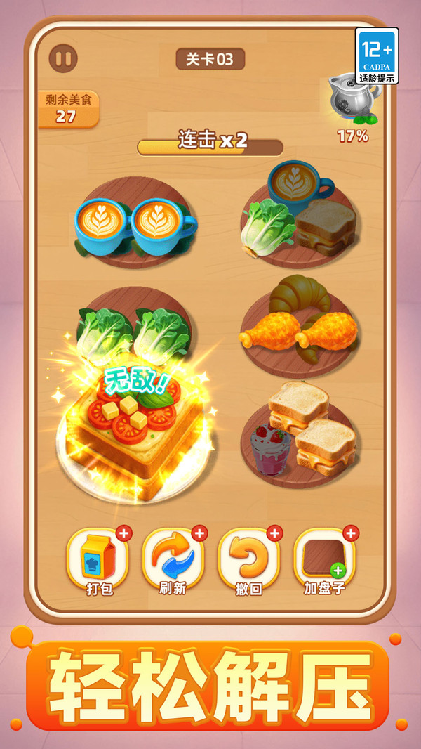 3.将经典的消除乐趣与美食主题巧妙融合,通过目标明确的订单玩法和丰富多样的关卡设计,让消消乐闯关挑战拥有更多乐趣!