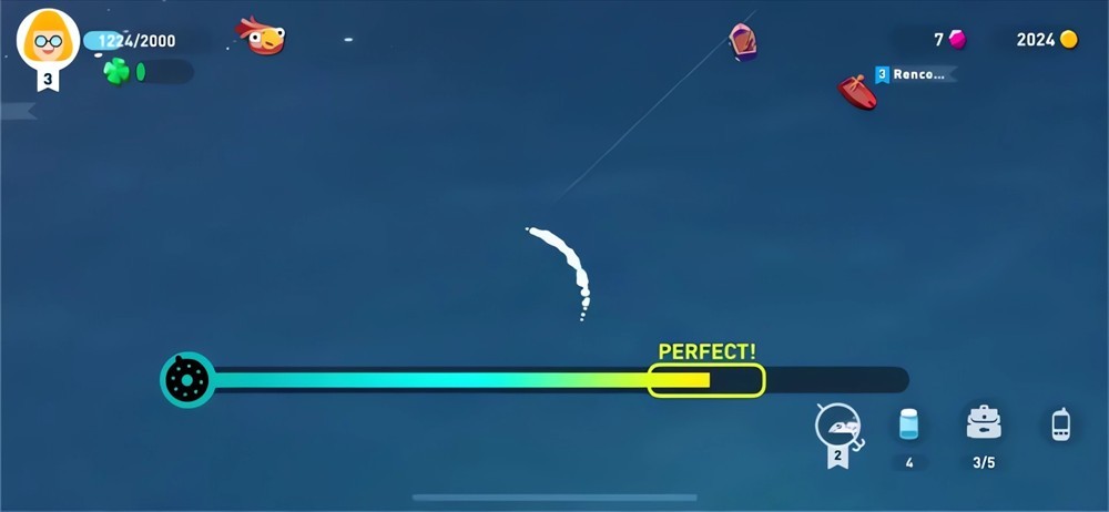 特色钓鱼与物资收集:钓鱼是游戏的核心操作之一,不同体型的鱼对应水下不同的阴影轮廓,上钩时会有相机拉近、浮标浮动等明确信号。捕捉普通鱼只需轻点屏幕,而稀有鱼类则需通过控制进度条保持重叠状态才能成功捕获。此外,玩家还能收集海面漂浮的宝箱、板条箱等物资获取金币和各类材料。