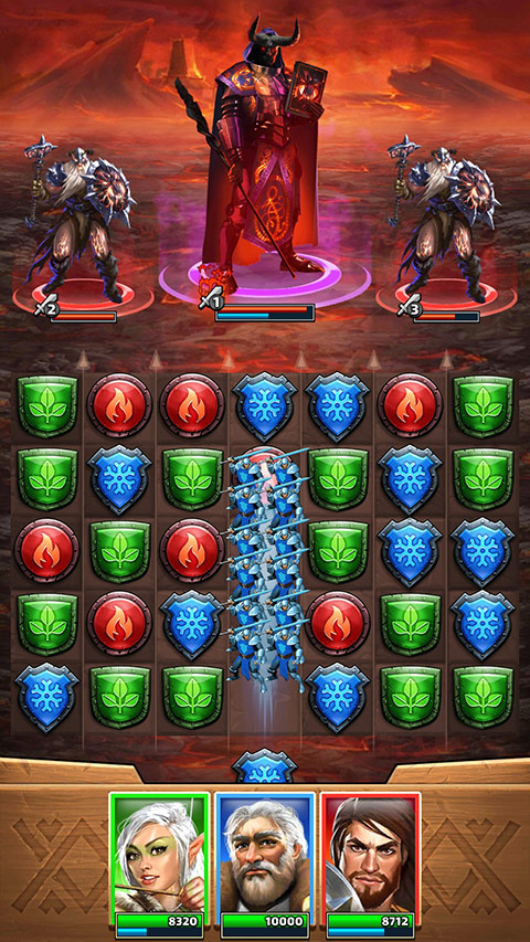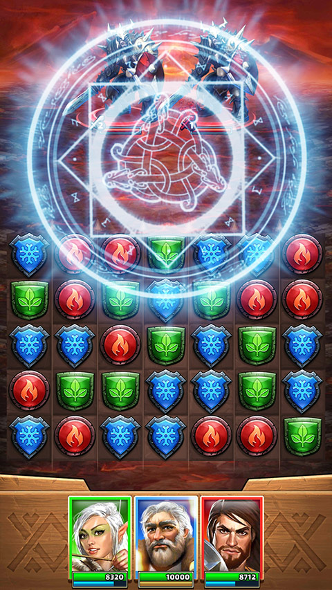 策略型三消战斗:这是游戏的核心战斗形式,采用回合制机制。玩家通过消除同色宝石积攒能量,能量满后可释放英雄技能,连消或多宝石消除还能触发范围 AOE 伤害等强力效果。游戏存在烈火、自然、神圣等五种元素,且元素间有克制关系,搭配不同职业的英雄组队,能搭配出多样战术,比如用法师英雄搭配大范围消除,快速清场群敌。