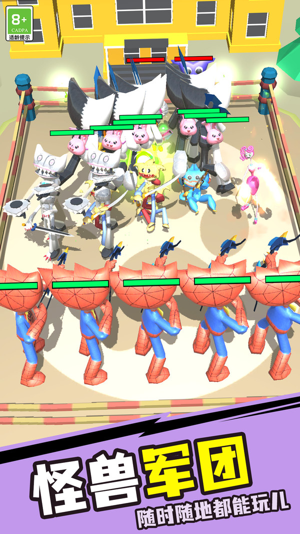 2、核心玩法围绕怪兽战斗展开,玩家操控已拥有的怪兽与敌军交锋,通过击败敌人获取奖励,用于解锁新怪兽或强化现有战力。