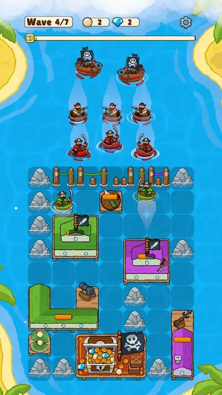 3、海盗会从不同航线驶来,且路线可能随玩家布防实时变化,需预判敌方路径并预留升级空间。
