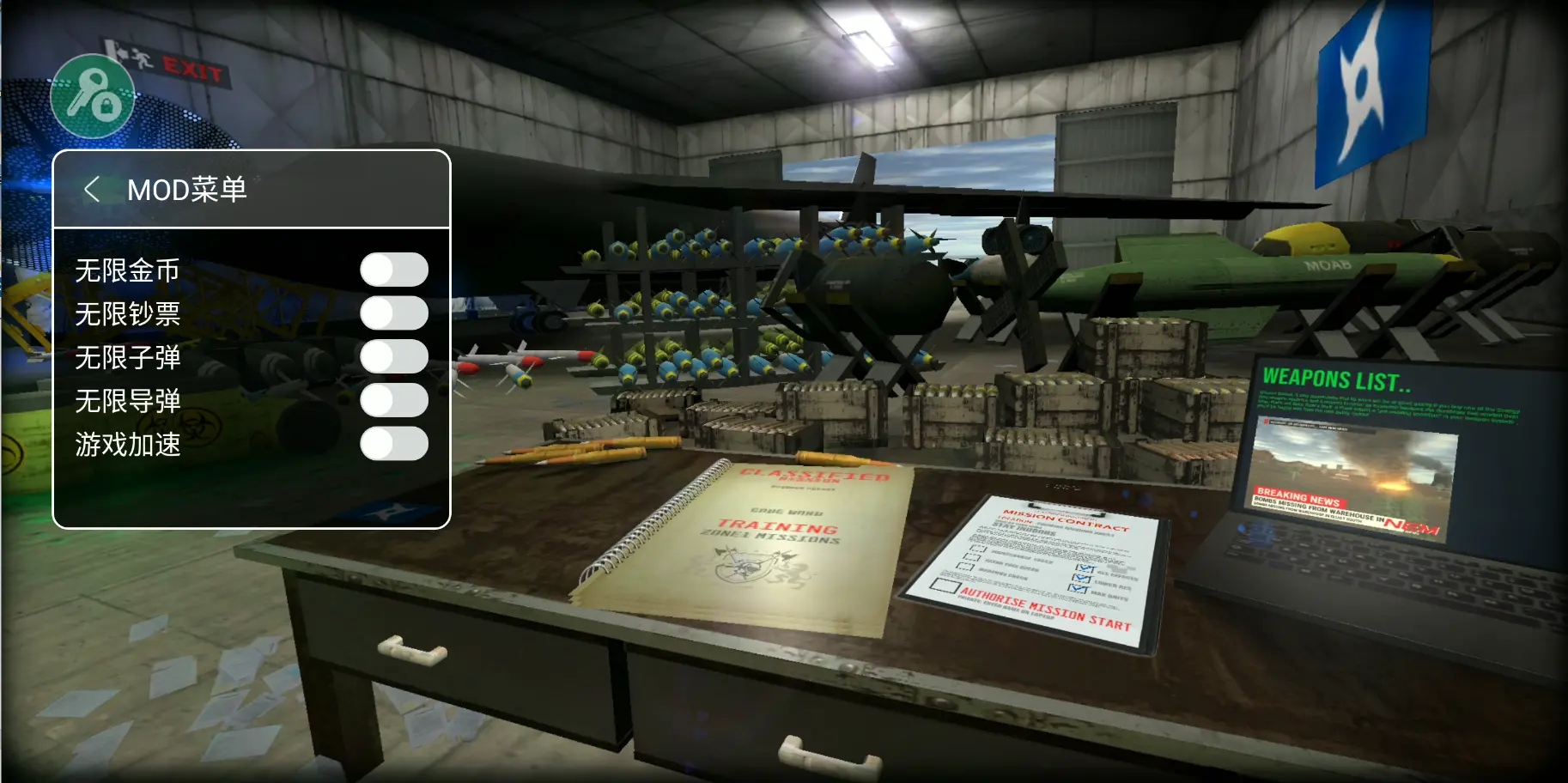 简洁易上手的操控:游戏操作以虚拟按键为主,左下角按钮可控制镜头或飞行方向,中间标识能校准准星;点击屏幕任意位置可启动机枪扫射压制敌人,右下角的核弹图标则用于投放核弹。此外点击屏幕左上方可缩放视野,右上角还能快速切换机枪和核弹,操作逻辑清晰,新手可快速入门。