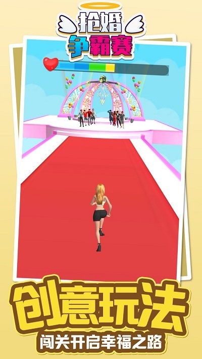 1、创新融合收集要素与竞速玩法,玩家需要在快速移动的同时精准收集鲜花、礼金等资源来提升心动值。