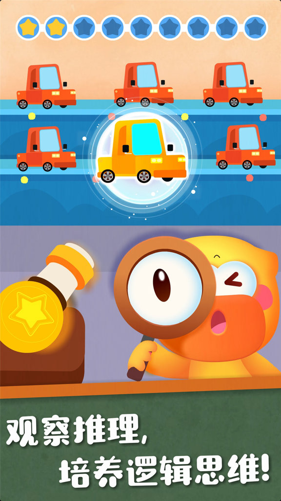·综合观察训练:求助!坏蛋机器人藏起来了。机器人会变身成特殊颜色的苹果,宝宝快来找不同吧。这一课程环节,综合锻炼了宝宝观察力、分类、判断等技能。游戏难度会随着孩子能力的提升而逐步增加,持续激发孩子的挑战欲望。