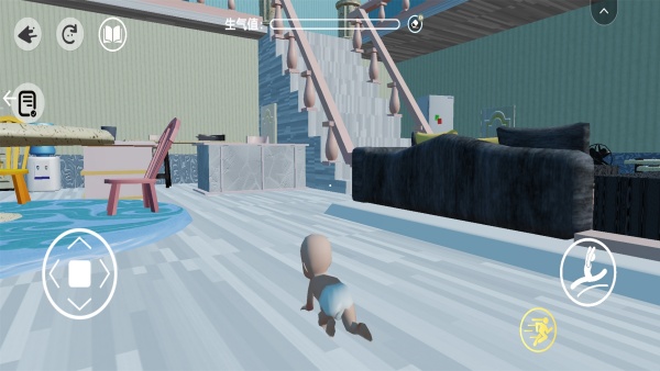 1、通过虚拟摇杆操控婴儿爬行移动,利用低视角优势钻入家具缝隙等隐蔽角落躲藏。