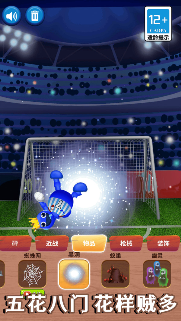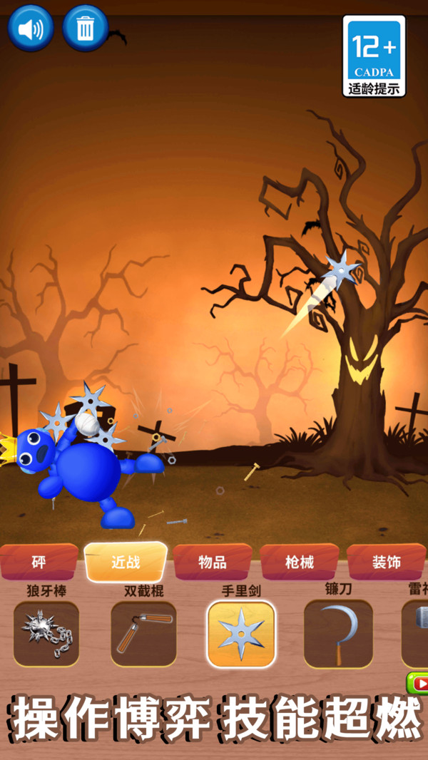 3.手指滑动屏幕,把武器炸弹都扔给小蓝人,通过进一步的探索,玩家可以解锁更多的道具和玩法。