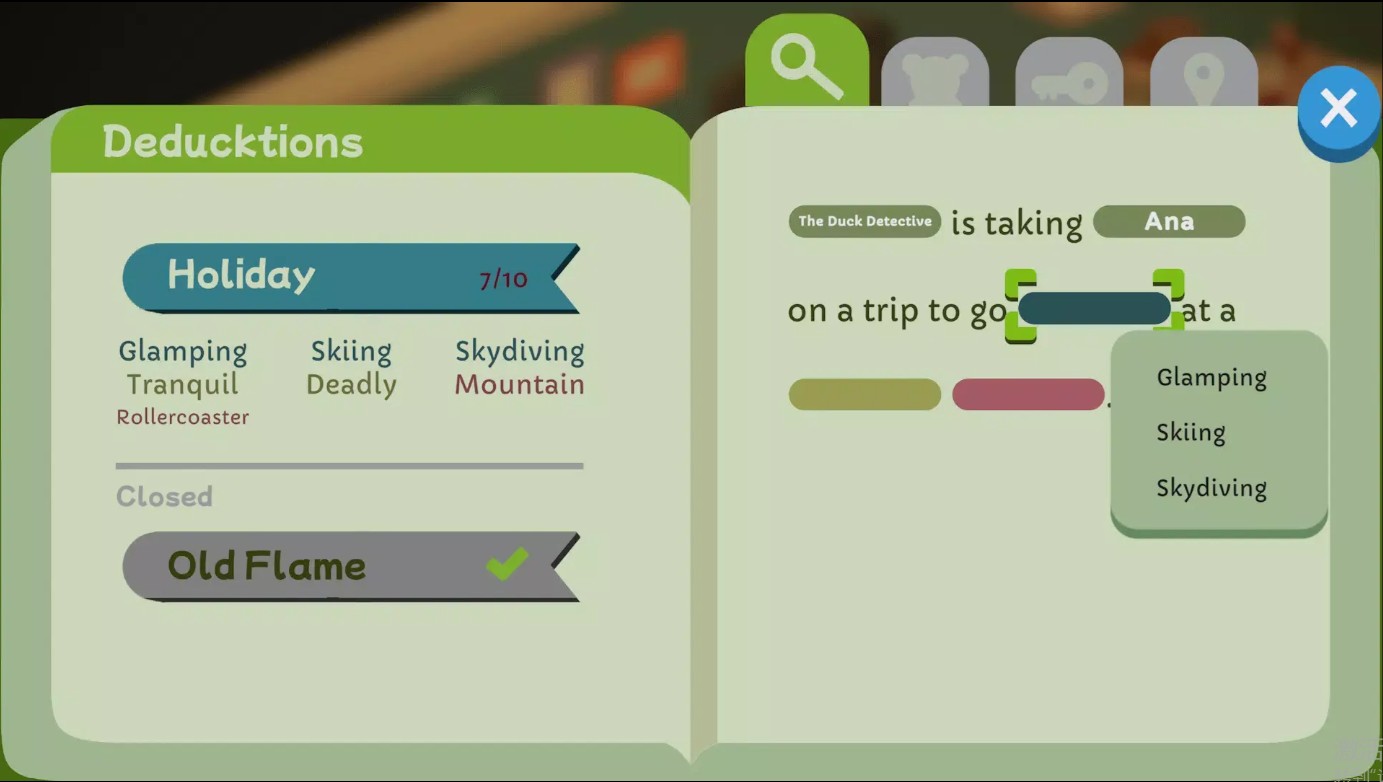 《鸭鸭侦探幽灵露营》:在这款游戏中,你将化身为一位独具特色的鸭子侦探。游戏采用独特的填空形式,巧妙地将线索串联,极大地激发了玩家的推理潜能和智慧。这款游戏特别适合那些热衷于解谜挑战的玩家。喜欢的快来下载吧!