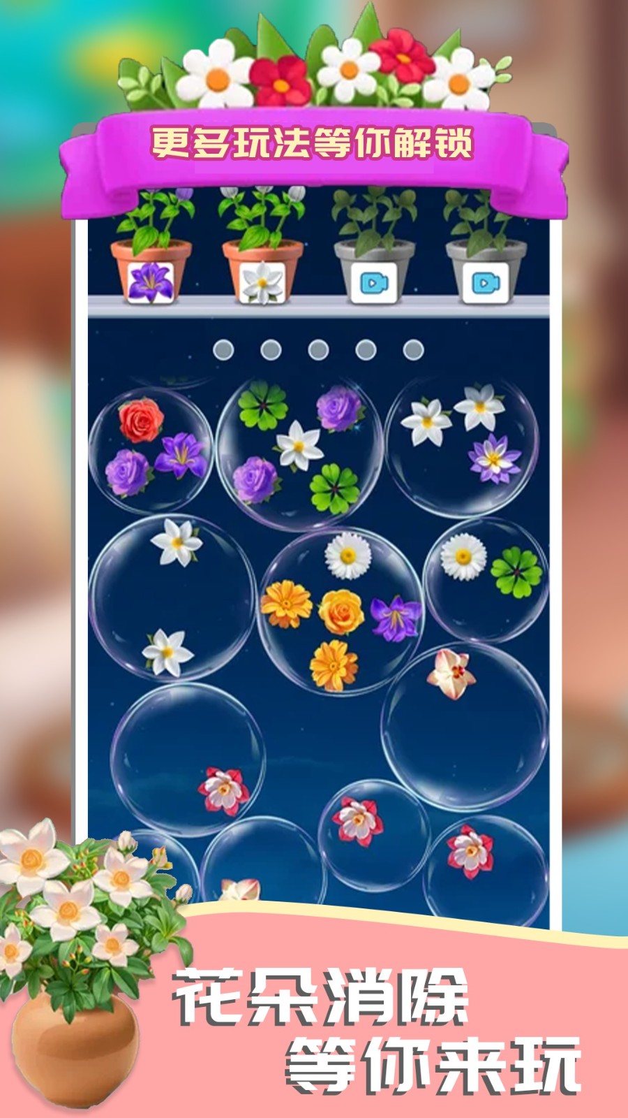 这花太棒了是一款治愈休闲的消除挑战游戏,以花朵匹配消除为核心玩法,搭配细腻逼真的花朵绘制与绚烂梦幻的消除特效,玩家需根据目标花盆需求,点击气泡中的对应花朵存入临时花槽,集齐三朵同种类花朵即可触发消除,在唯美光影中享受解压乐趣。