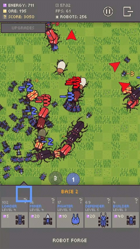 机器人殖民地手游是一款休闲趣味的模拟经营策略游戏,采用像素卡通画风。玩家要负责自动机器人的生产与升级,驱使它们采集资源、清理昆虫,防止虫害。游戏设有多种难度级别,玩家需合理分配资源,生产不同类型的机器人,壮大基地,抵御虫子对基地的攻击。