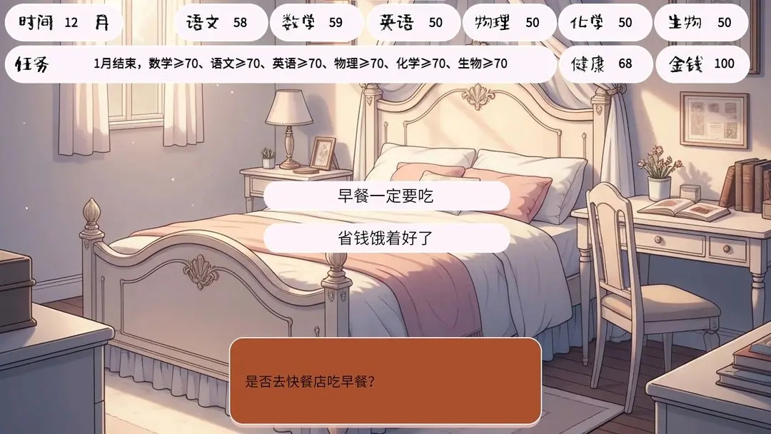 多维度数值管理:玩家要平衡主角的学业、健康、金钱三大核心数值。学业上需完成课堂答题、模拟考试等任务提升成绩,应对高考目标;金钱方面得通过打工小游戏赚取生活费,还能解锁新的职业机会;同时要注意心理健康,压力累积过多可能导致崩溃,需适时进行调节。