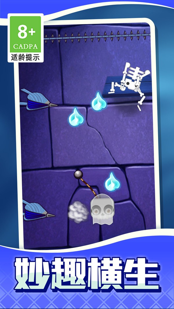 1. 玩家通过点击或滑动屏幕来操控核心骨头的移动,使其在包含平台、传送门和障碍物的复杂场景中探索并触及目标骨骼。