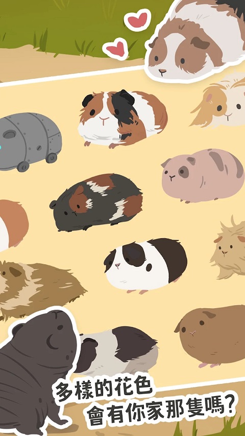 1、游戏提供多种天竺鼠品种,玩家可以收集并照顾每一只宠物。