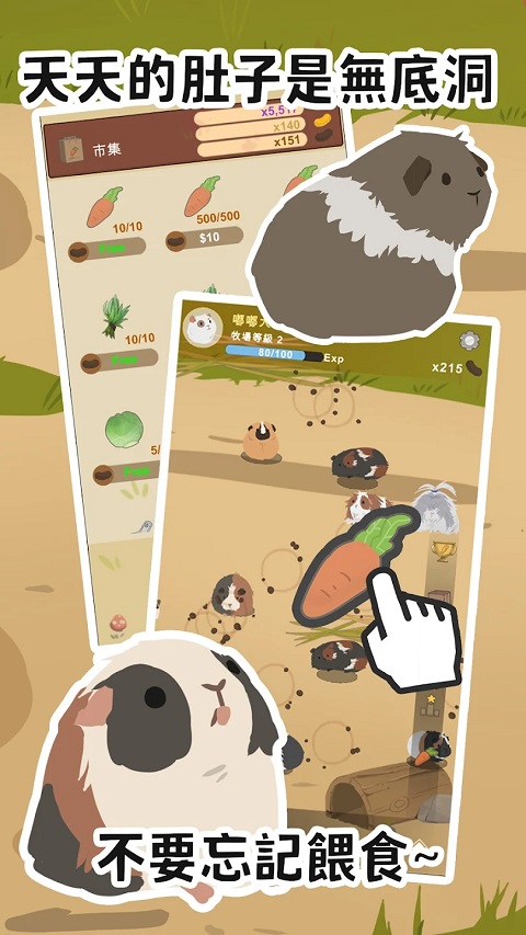 低门槛适配友好:操作上仅需点击屏幕完成喂食、买物资等操作,不管是新手还是休闲玩家都能快速上手。且游戏会持续更新内容,比如近期版本就新增了新的天竺鼠品种,丰富游玩体验。
