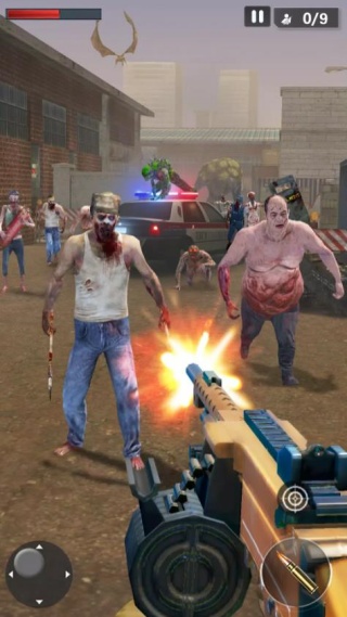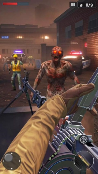 1、通过虚拟双摇杆操控角色移动与射击,左摇杆控制走位,右摇杆瞄准并开火攻击僵尸。