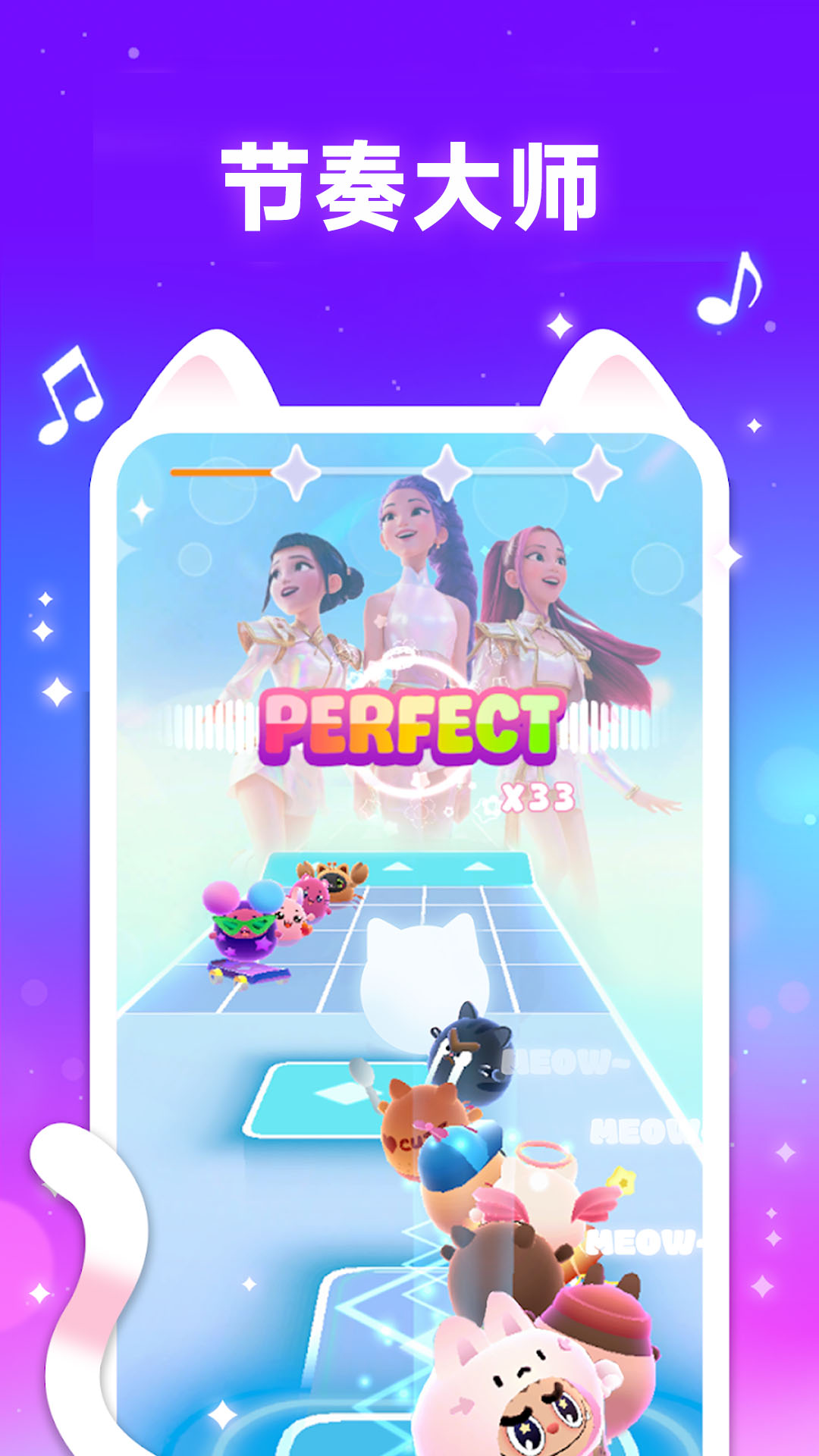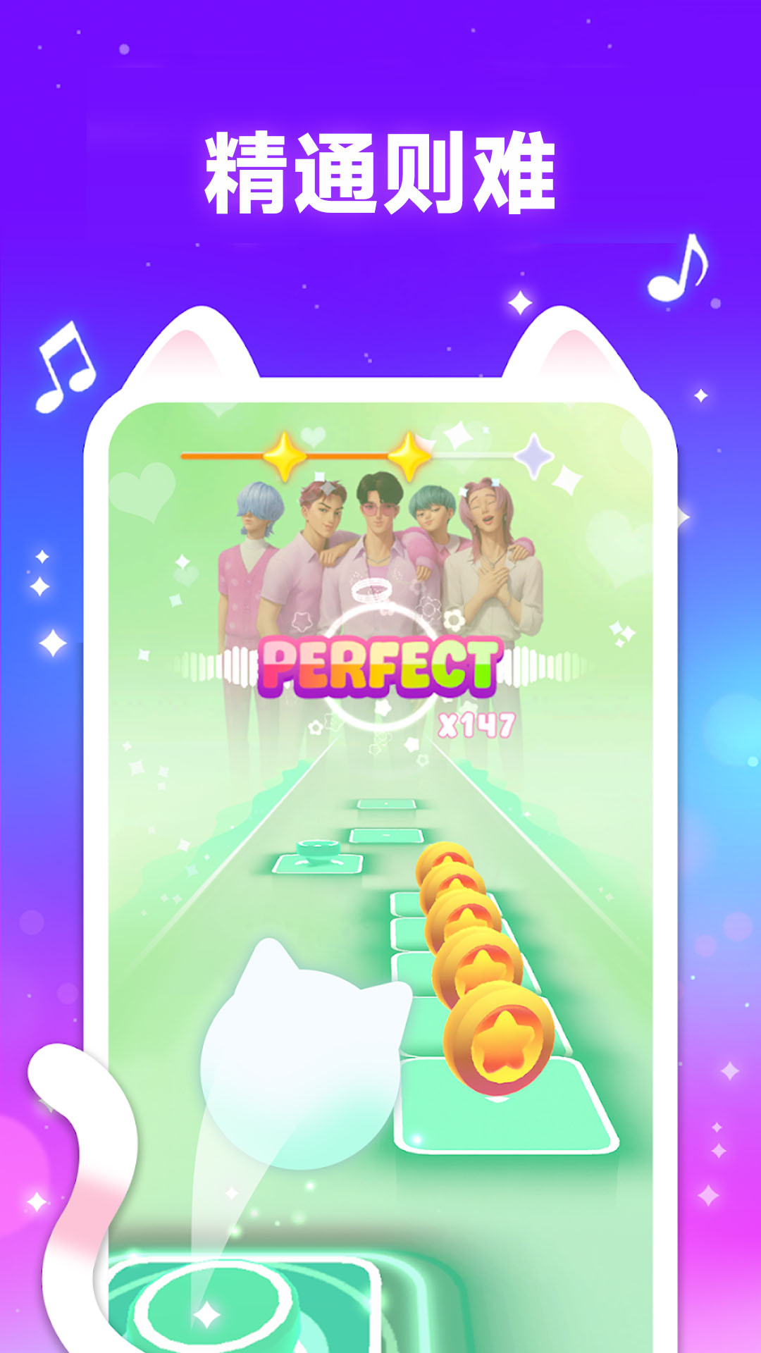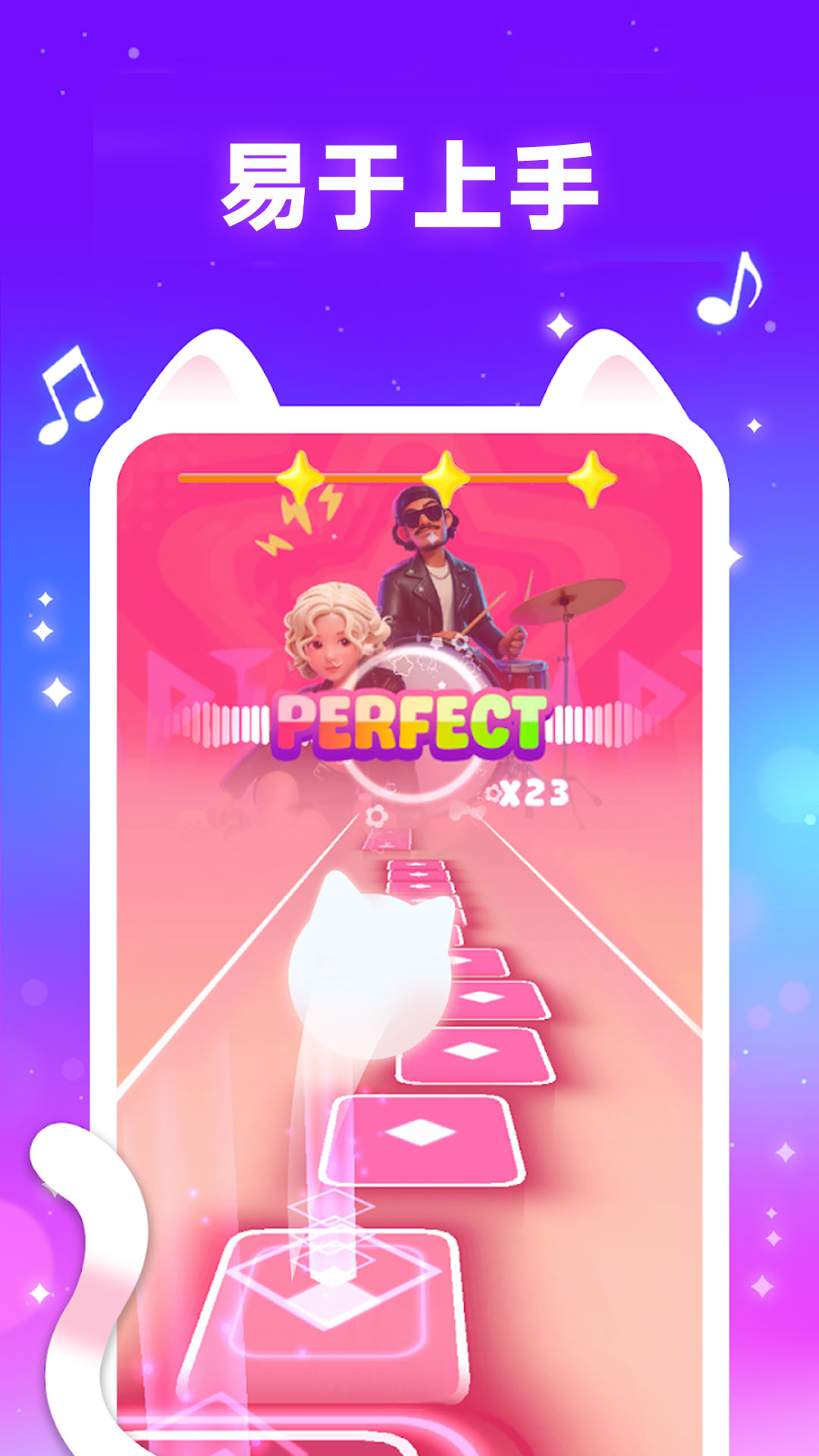 1、独特的钢琴图块机制:玩家需要根据音乐节奏,点击或滑动屏幕,引导猫咪跳跃到正确的方块上,享受音乐带来的乐趣。