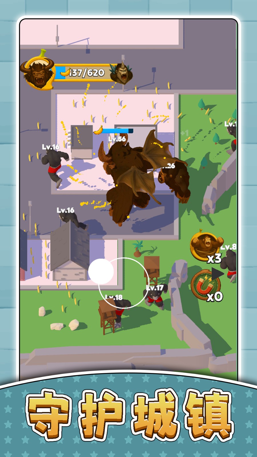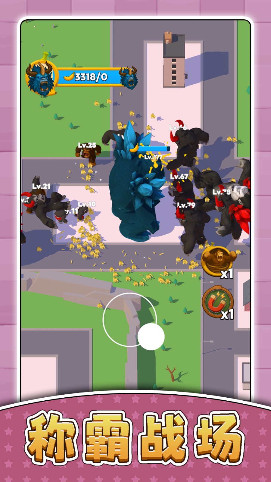 1、玩家扮演猴子收集物资,待成长达标触发角色进化,同时需防范对手抢夺资源,不断的升级去完成挑战吧。