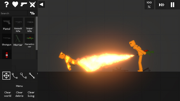 布娃娃互动与破坏:这是游戏的核心解压玩法。玩家可添加多个布娃娃角色,给它们装配手枪、步枪、喷火器、炸弹等武器,还能搭配剑、长矛等冷兵器。若想让角色互相攻击,给其配备武器后快速点击两下武器,再点击 “Activate” 就能启动对战。而且借助物理引擎,布娃娃被攻击时会呈现出贴合现实的动作与损伤效果,比如被刺伤、燃烧等画面,解压感拉满。