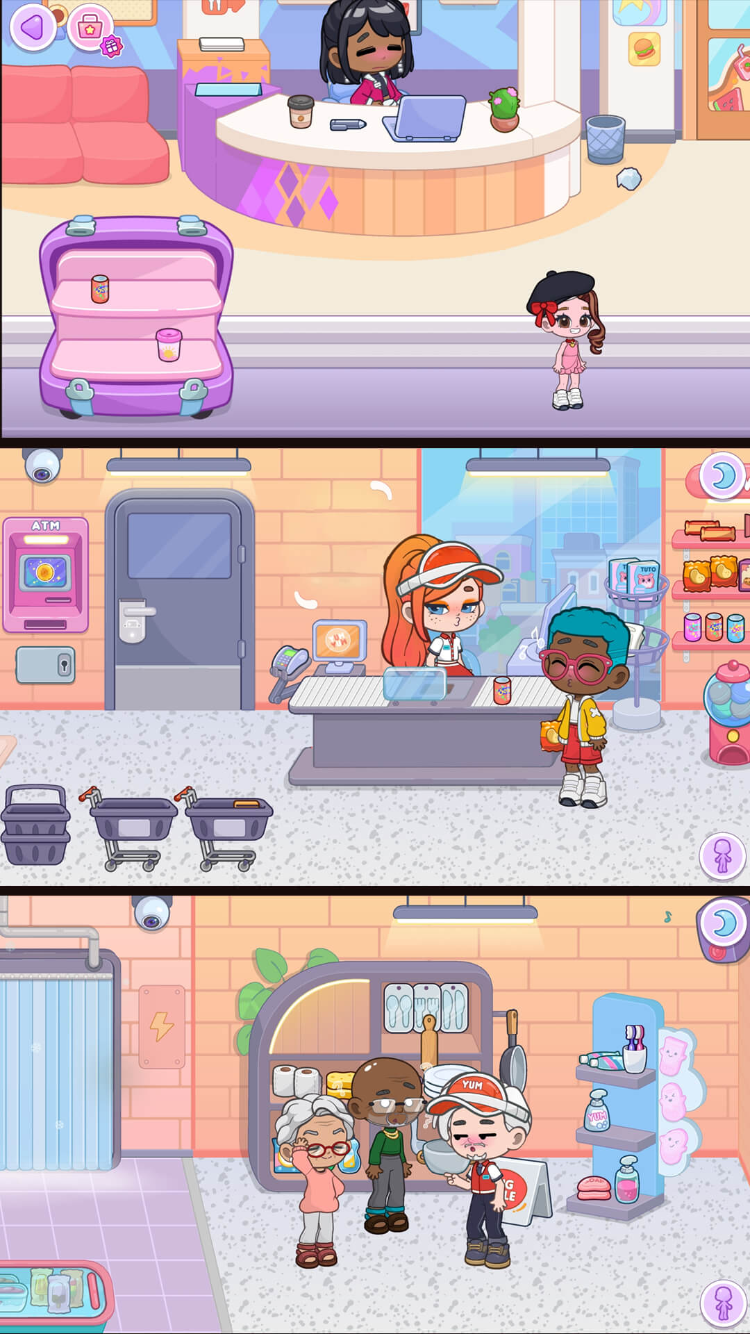 2、包含社交经营玩法,在咖啡馆等场景中,可选择店主身份打理店铺、制作餐食,或作为顾客参与互动,拓展小镇社交关系网络。