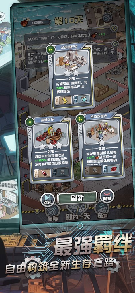 模拟经营:游戏结合了模拟经营元素,玩家需要经营自己的避难所,对资源进行有效管理。通过不断优化和升级避难所,玩家可以提升生存概率和舒适度。