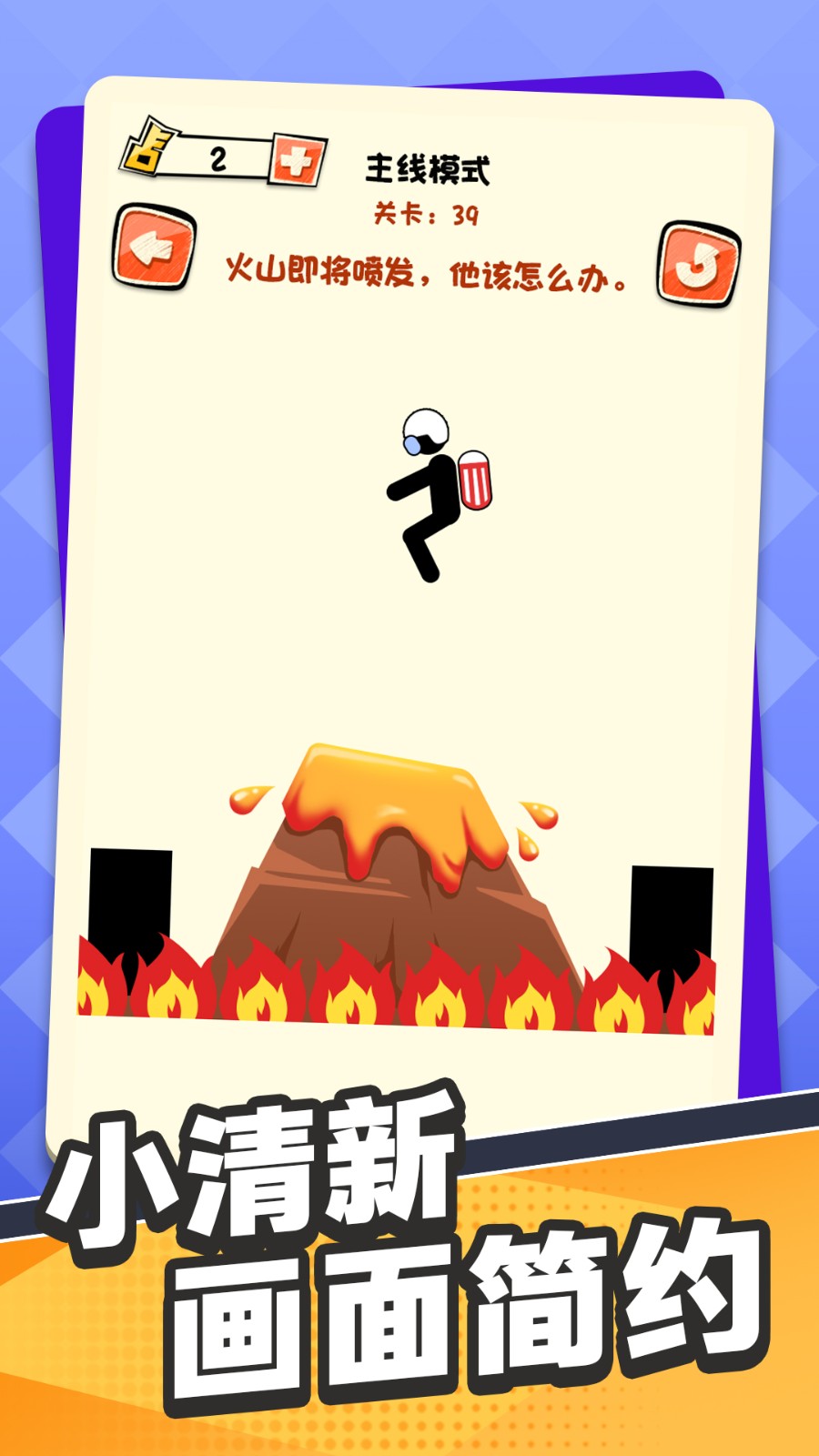 1、采用简约童趣的火柴人画风,角色表情生动、动作鲜活,场景设计简洁却富有辨识度,能让玩家快速聚焦于解谜核心,避免视觉干扰。