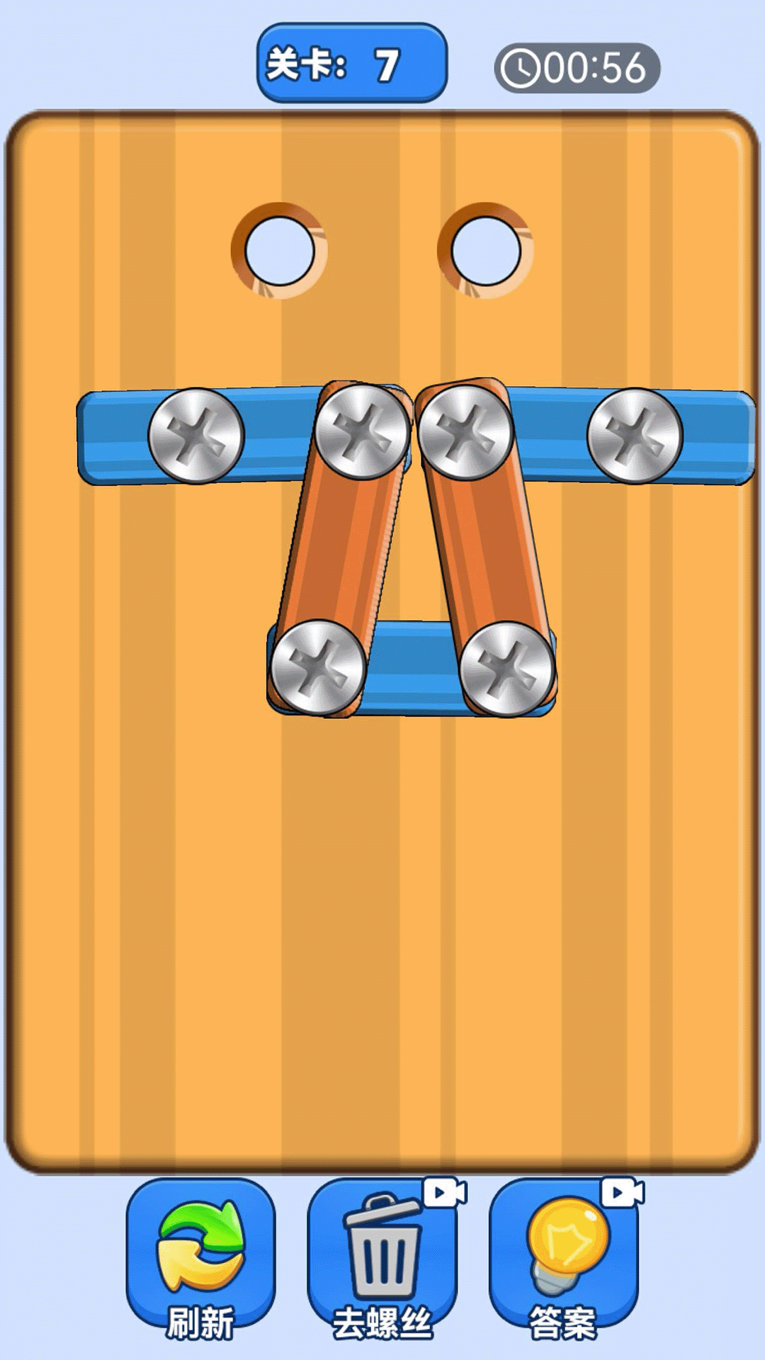 4、合理使用下方道具,“去螺丝” 是核心操作键,遇到卡关时可借助 “答案” 键获取拆解思路,“刷新” 可重置当前关卡布局。