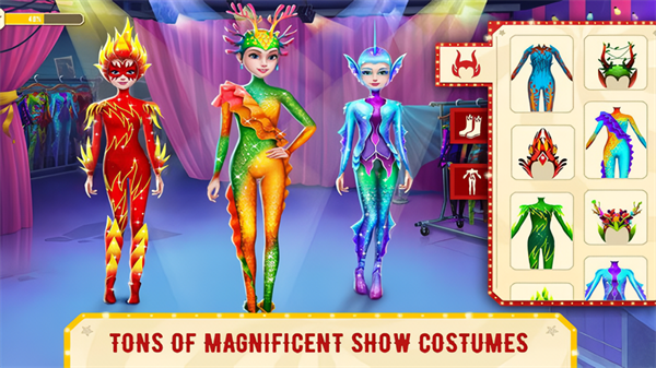 演员招募与养成:玩家可招募体操女孩、小丑、魔术师、驯兽师等多元角色,核心重点可培养体操女孩学习跳跃、旋转、空中飞人等高难度杂技动作。同时能为所有演员定制精致妆容、搭配复古马戏风、奇幻魔法风等多种风格的华丽服装,还可搭配炫目的珠宝和创意面具,打造专属舞台形象。