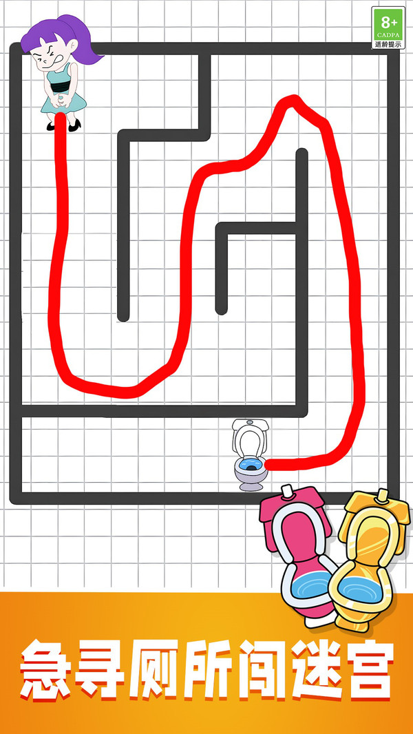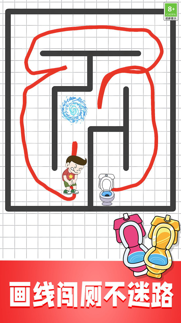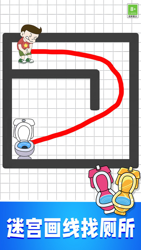 全关挑战小达人是一款轻松有趣的休闲益智游戏,它将简单的画线操作与迷宫解谜巧妙结合,非常适合在碎片时间放松心情并挑战一下自己的思维。玩家需通过画线引导角色找到厕所,游戏以轻松有趣的玩法和丰富的关卡设计为特色。