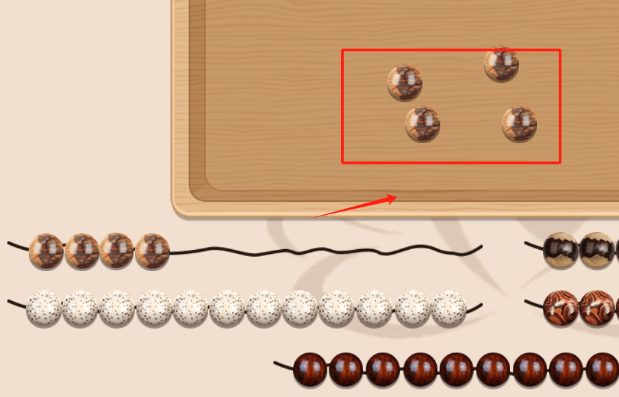 4、找到木板上红色箭头指向的珠子串,点击下方任意一串彩色珠子,开启盘串放松玩法。