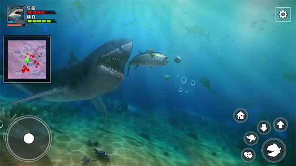 饥饿鲨鱼求生是一款把你放在食物链最顶端的沉浸式生存冒险游戏,在又大又漂亮但又处处是危险的海洋世界里,大鱼吃小鱼是唯一的规矩,你扮演一只从宝宝开始长大的鲨鱼,一边探索好看又吓人的海底。随时观察右上角的小地图,猎物会以小红点的形式标记,帮助你更高效地规划捕食路线。