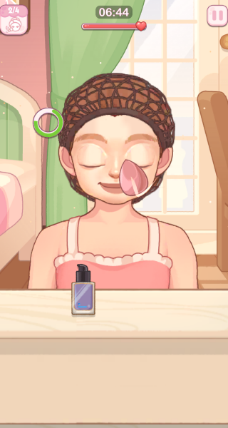2、按照指引为女孩佩戴发套,完成洗头清洁步骤,为后续发型打造与护肤化妆奠定基础。