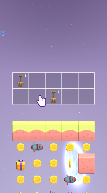 1、玩家从最基础的铁铲开始,通过拖拽合成相同等级的铲子,逐步升级为更高效的工具。