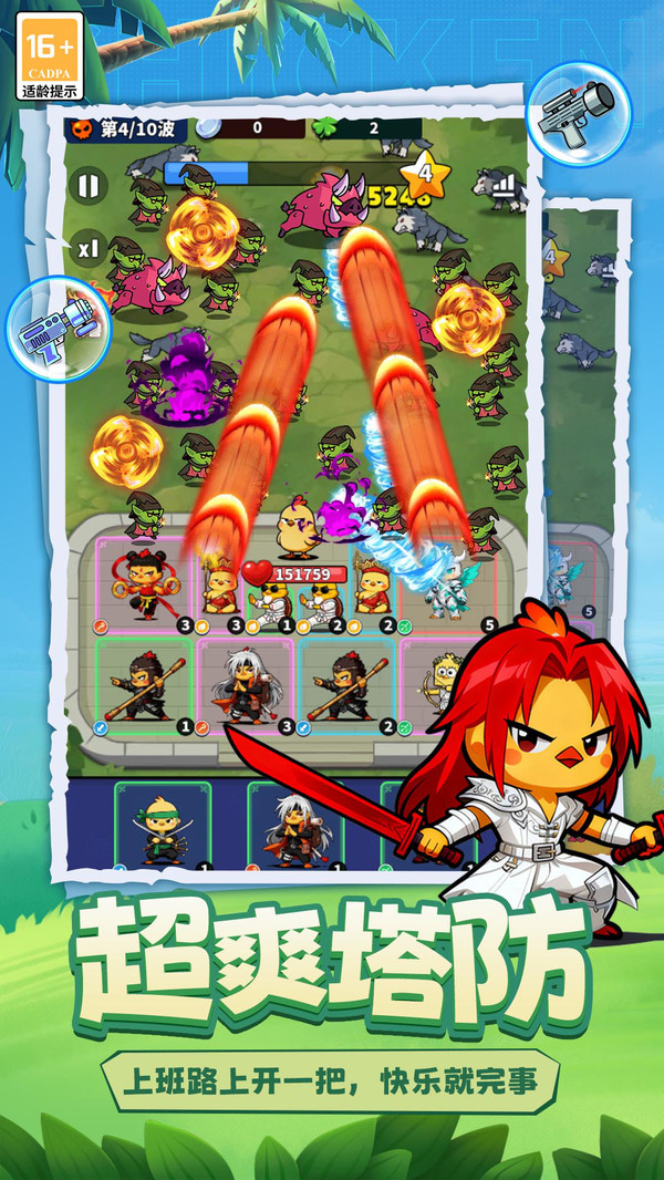 创新策略塔防玩法,集结双刀火鸡、精灵弓手、弓手保罗、小鸡法师等英雄击退怪物,战斗中可将相同英雄合成升阶,特定英雄还可触发召唤远古神兽,局势瞬间翻转!选对英雄,找准时机摆放,胜利不费吹灰之力!