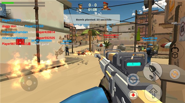 射击与建造联动:这是游戏的核心特色之一。玩家可采集木材、砖块等资源,遇敌时快速搭建墙壁、高台等结构,既能用防御墙阻挡攻击,也能靠高台抢占视野优势。搭配涵盖突击步枪、狙击枪等的数十种武器,再加上烟雾弹、手雷等战术道具,可衍生出多样战术,比如近距离用霰弹枪配烟雾弹突袭,中远程用带倍镜的突击步枪压制,建造与射击的配合让对战更具变数。