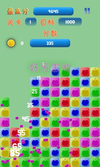 1.是一款的消除类手机游戏,令人很容易成瘾,游戏玩法便是点一下同样颜色的苹果开展消除。
