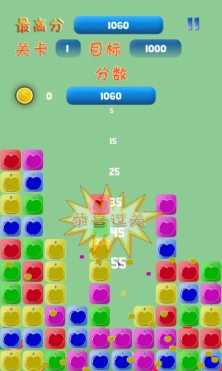3.通过消除各种各样画面中同样颜色的苹果就能完成消除,你在进行闯关的过程中要尽可能的一次性消除大量的苹果才能够获得更高的分数。