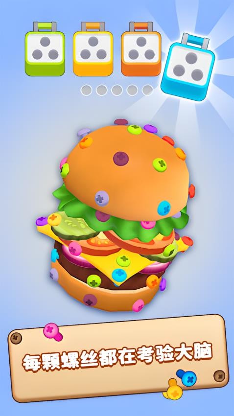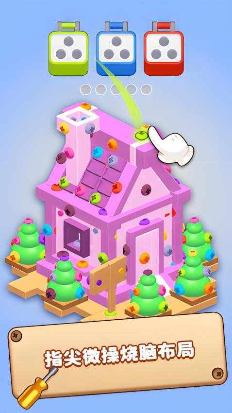 游戏里的螺丝藏在超多趣味场景里!椅子上爬满几十个、房屋上挂满一串串、汽车上堆得满满当当,每一处都有解锁不完的惊喜挑战,操作超简单,跟着盒子颜色点点点对应的螺丝,分类消除一气呵成,小白也能秒上手!