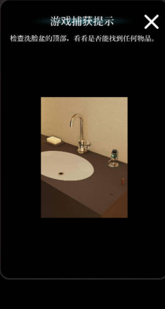 12.左转到门口,使用【钥匙】打开洗手池柜子,拾取里面的【半块苹果图案】。