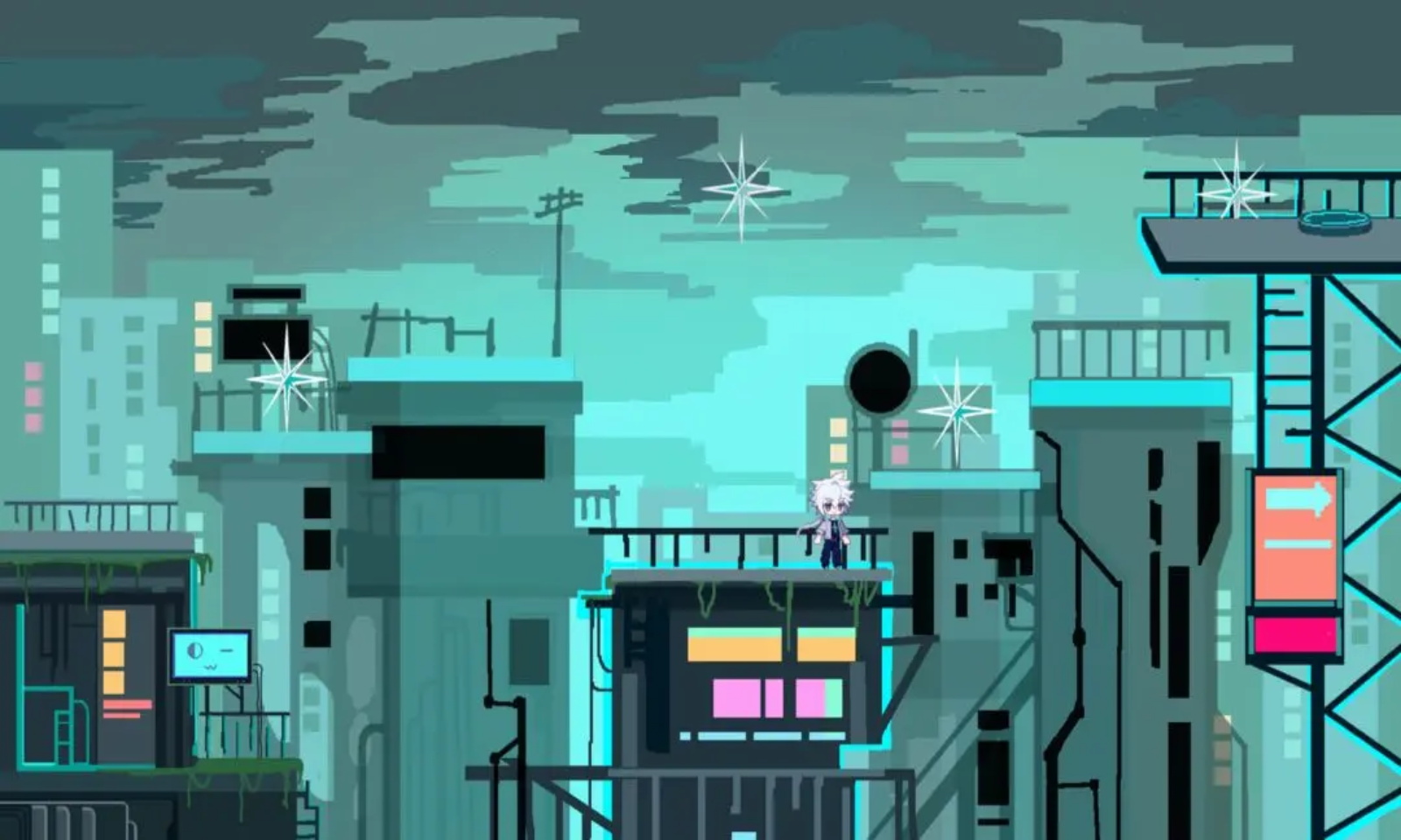 赛博手绘美术风格:采用 16 色调色板模拟 CRT 故障效果,逐帧手绘赛博都市,场景层次丰富。不同图层有差异化视觉特征,角色移动时会触发动态干扰效果,如像素撕裂残影、信号中断闪烁过渡等,兼具美观与功能指引作用。